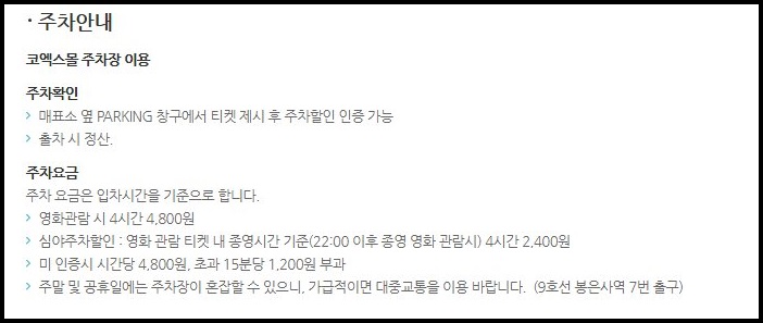 코엑스 메가박스 주차장은 코엑스몰 주차장을 함께 이용하고 있습니다. 영화 관람객이라 하더라도 4시간 4,800원의 주차요금이 발생한다는 점 참고하시기 바랍니다.