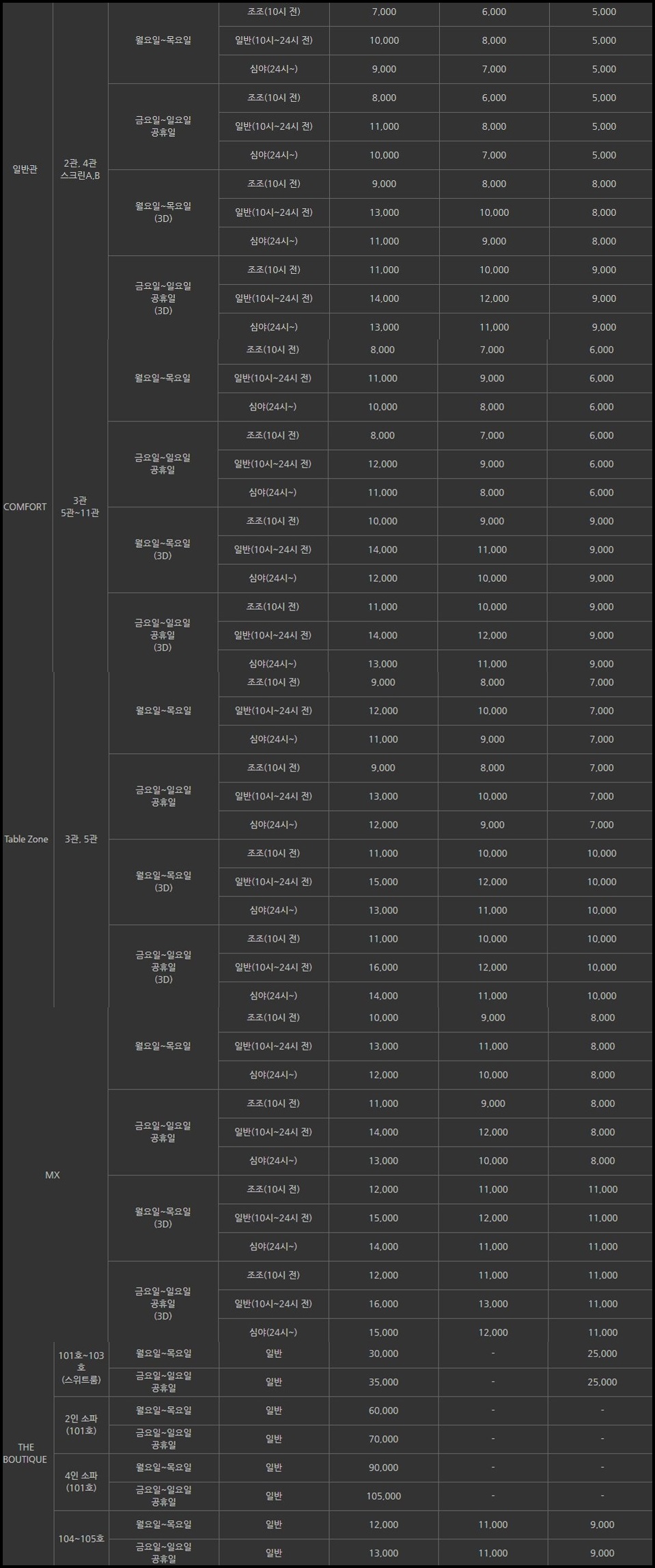일반 성인 기준 주중 요금은 10,000원의 요금이 정해져 있지만 주말요금의 경우 11,000원, 컴포트관 12,000원, 테이블 존(Table Zone) 13,000원, 더 부티크(THE BOUTIQUE)의 경우 30,000원 에서 105,000원까지 금액이 다르게 소개되고 있습니다.
