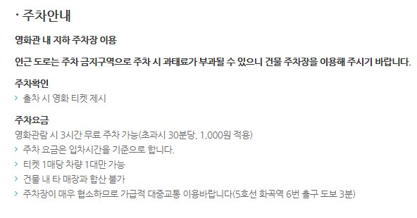 자가용을 가지고 방문하시는 경우 화곡 메가박스 지하주차장을 이용할수 있습니다. 화곡 메가박스 주차요금의 경우 당일 영화관람객들에게 3시간 무료주차를 제공하고 있습니다.