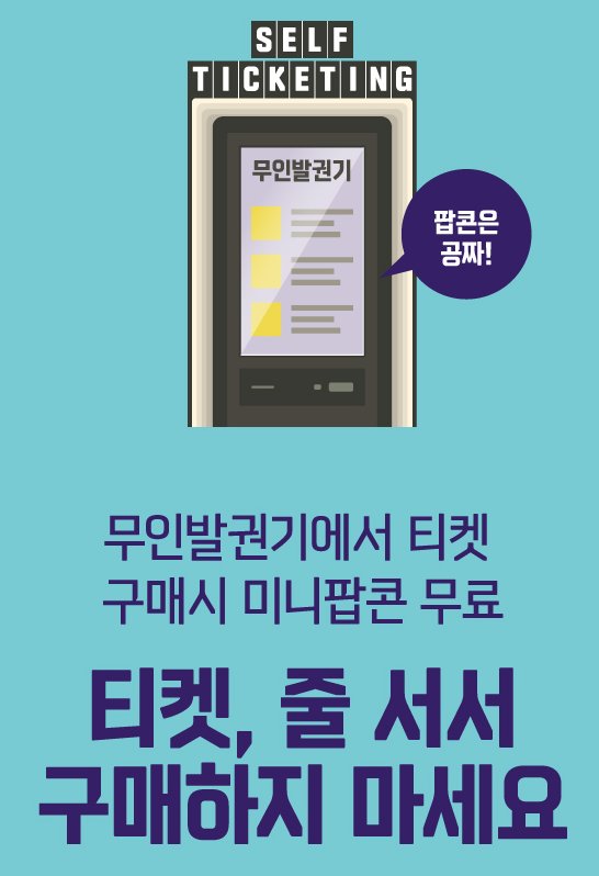많은 분들이 온라인으로 영화티켓을 예매하시는 경우가 있는데요 영화관 내에 있는 무인발권기를 통하여 예매시 미니팝콘을 무료로 드리는 이벤트를 진행하고 있다고 합니다.