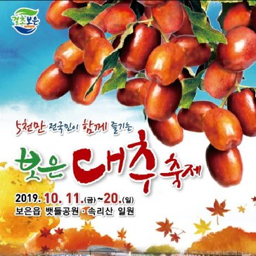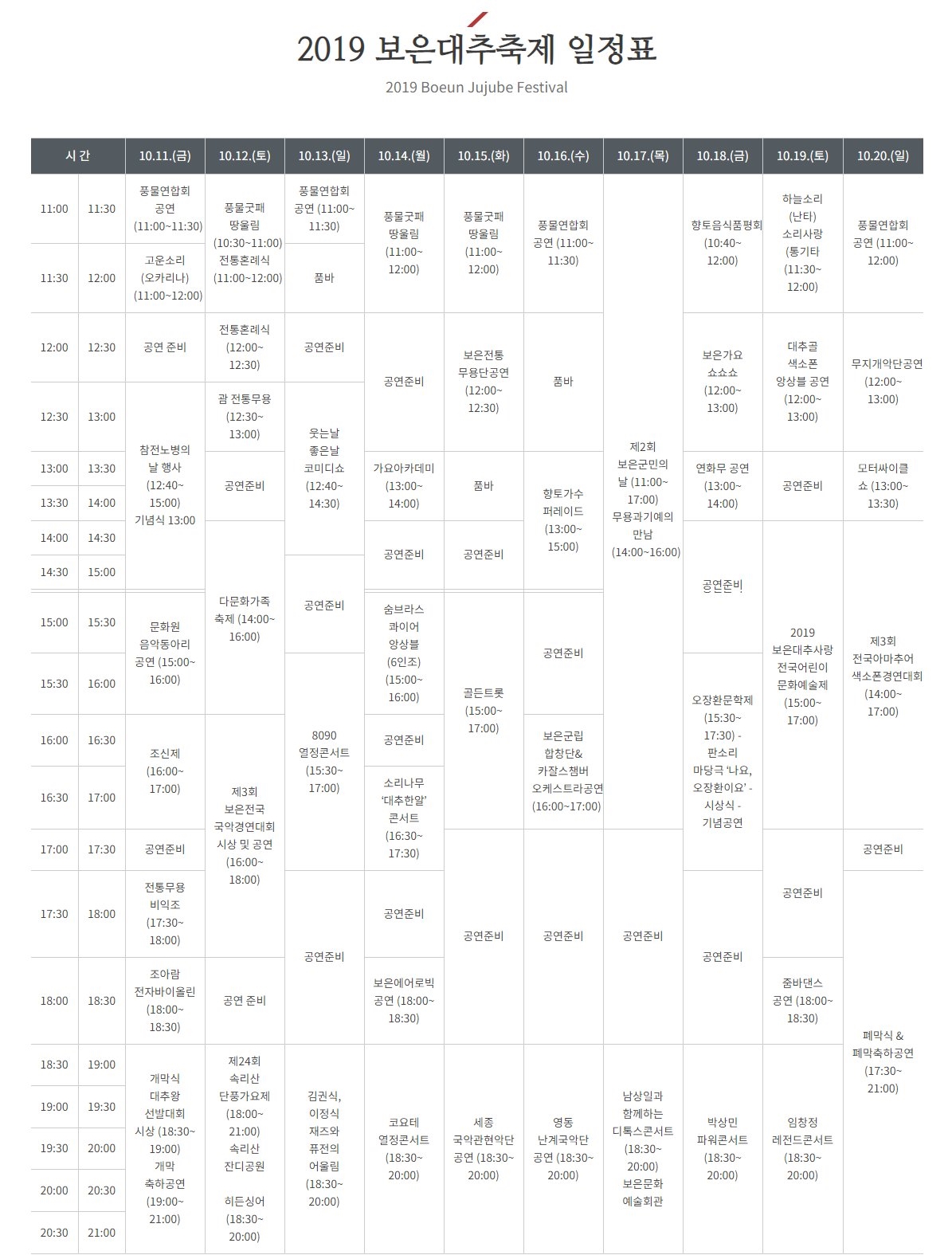 이번에 진행되는 2019 보은 대추축제 일정은 2019년 10월 11일 부터~20일 까지 10일간 진행될 예정이다.