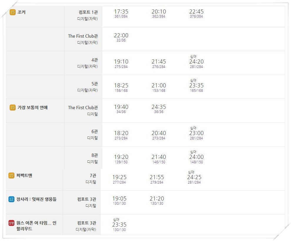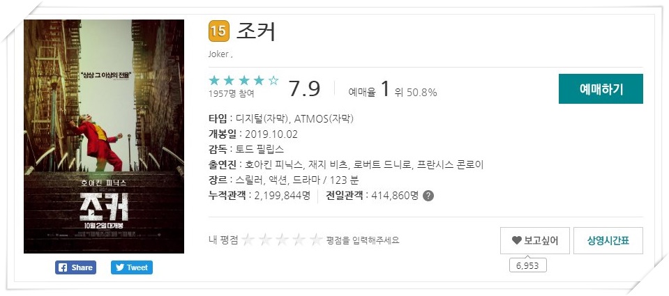 현재 영화예매 순위를 살펴보면 10월 2일 개봉한 조커가 영화예매 순위에서 1위에 올라있습니다.