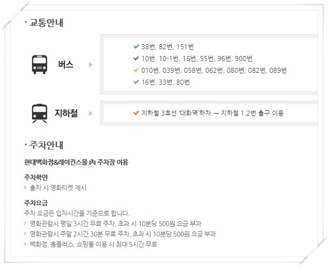 메가박스는 킨텍스점 주차는 현대백화점 레이킨스 몰내 주차장을 이용할 수 있습니다.
