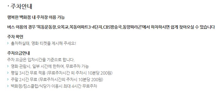 당일 영화 관람객들의 경우 평일 3시간 무료주차, 주말의 경우 2시간까지 무료주차가 가능합니다.