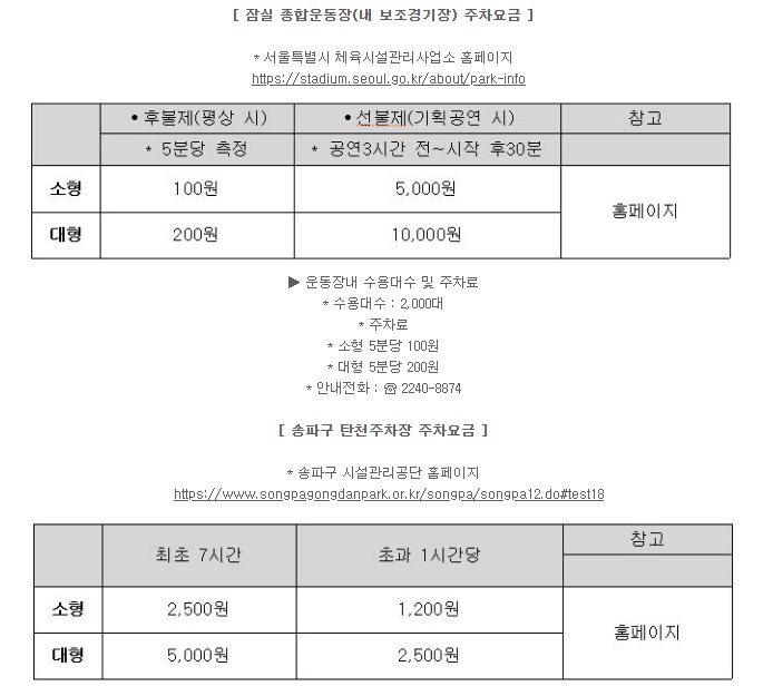 당일 많은 BTS의 국내 팬들 및 해외 팬들이 몰릴 것으로 예상이 되는 잠실 종합운동장 주차요금은 소형, 대형에 따라 조금 다르게 적용되고 있습니다.