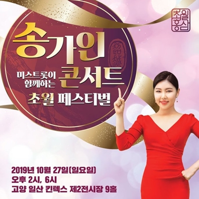 2019년 10월 27일(일) 고양 일산 킨텍스 제 2 전시장 9홀에서 열리는 송가인과 미스 트롯이 함께하는 초월 페스티벌은 그의 인기뿐만 아니라 트롯의 인기를 실감할 수 있는 자리가 될 것이라고 한다.