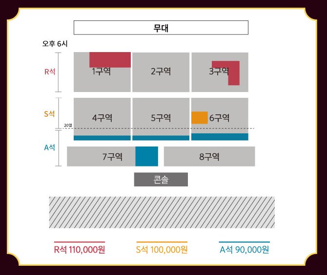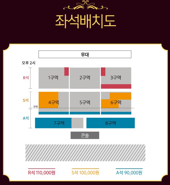 공연은 두 시간의 공연으로 구성이 돼있으며 2시, 6시 공연의 좌석 배치도는 다음과 같다.