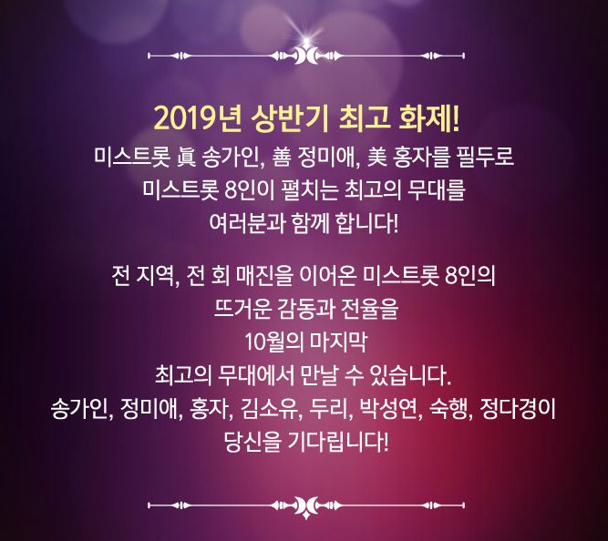 미스 트롯을 관람한 분들은 아실만한 이미 유명해진 분들이 총출동하여 자리를 빛내줄 것이라고 한다.