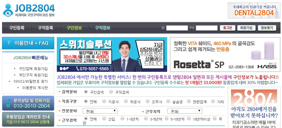 덴탈2804라는 치기공관련 전문 사이트에서 운영하고 있는 잡2804 사이트는 취업전문 사이트로 치기공사들의 최신일자리정보가 매일마다 업데이트 되고 있어서 많은 치기공사들이 이용하고 있습니다.