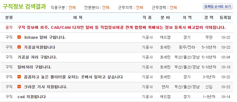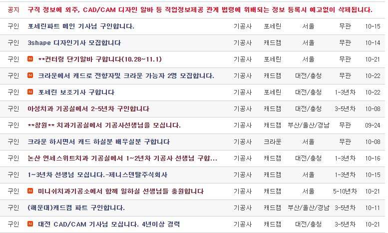 실제 홈페이지에 접속해보면 다양한 치과 기공사 모집관련 글 과 취업관련글들을 확인할수 있습니다.