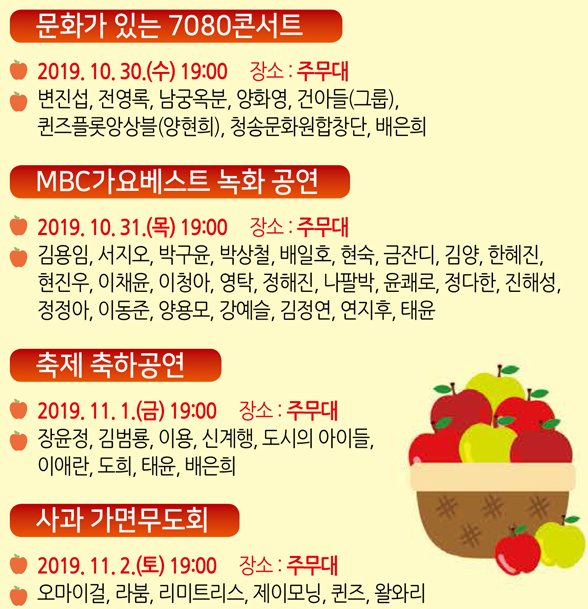 이번에 진행되는 2019 청송사과축제는 그 어느 때보다도 많은 인기가수들의 참여로 축제가 더욱 빛날 것이라고 합니다.