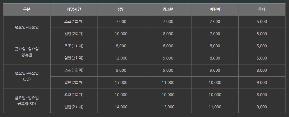 메가박스 영화요금을 살펴보면 주중 및 주말이 각각 다르게 적용되고 있습니다. cgv, 롯데시네마와 마찬가지로 주말요금이 비싼 편인데요 약 2,00원 정도의 차이가 있습니다.