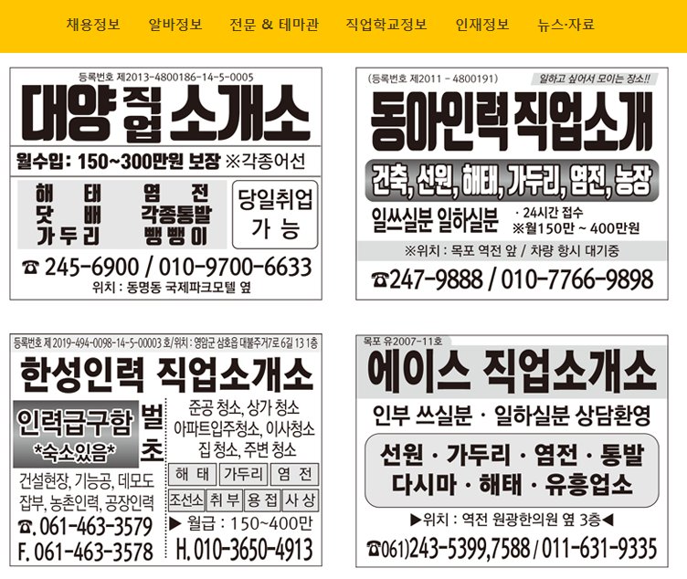 다행스럽게도 목포지역은 지역주민들에게 생활정보 및 각종 구인구직을 제공해 주는 사이트들이 많이 있어서 취업이 다소 수월한 편이라고 합니다.