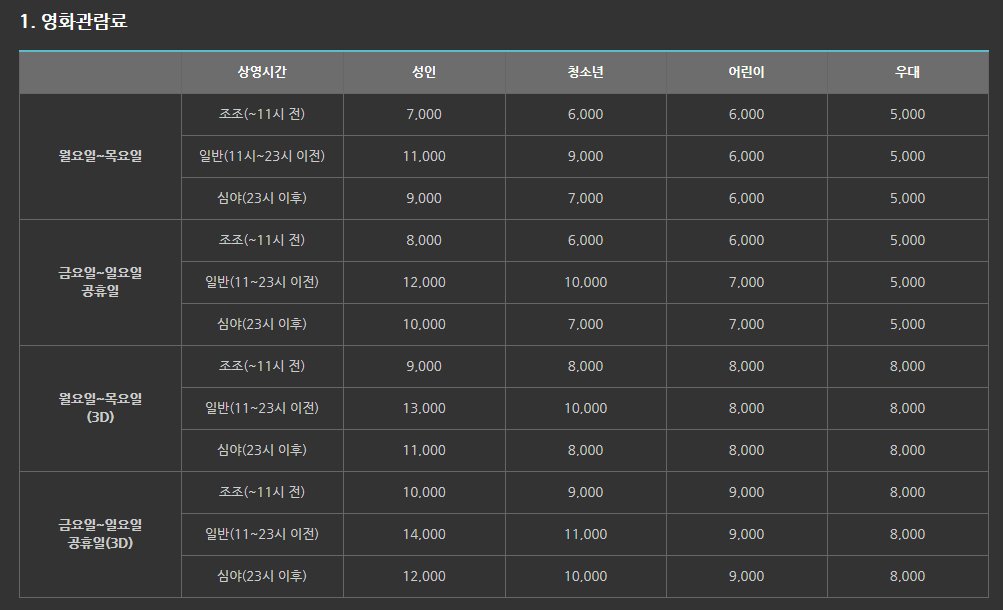 주중 및 주말에 따라 가격이 다르지만 상영관마다 가격이 다른 점도 있습니다.
