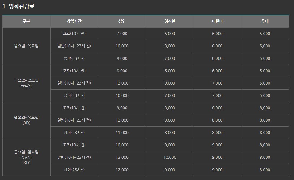 일반 영화 및 3D 영화, 상영관에 따라서 각각 다른 요금을 보이고 있는 만큼 영화요금도 확인해 보시기 바랍니다.