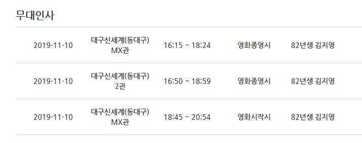 메가박스 대구 신세계 무대인사 일정입니다. 82년생 김지영이 개봉을 하면서 많은 인기를 얻고 있습니다.