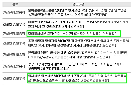 건설직 일용직 노동자들의 경우 60~70대 구직자들을 대상으로 모집하는 구인광고가 있는 것도 장점이다.