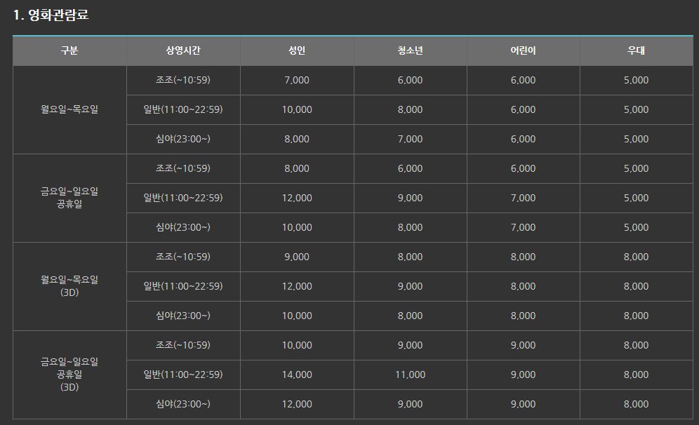 영화요금이 다소 비싸다고 느끼는 분들은 다양한 할인 혜택을 받는 것도 좋습니다. 통신사 멤버십 카드, 신용카드 제휴 할인도 가능하니 자세한 할인 혜택은 홈페이지를 참고하시기 바랍니다.