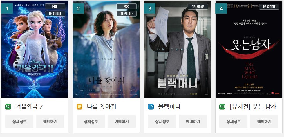 현재 개봉작 중에서 메가박스 영화예매 순위를 살펴보면 겨울왕국2, 나를 찾아줘, 블랙머니, 웃는 남자 순으로 인기를 얻고 있습니다.