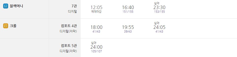 오늘 기준 청라지젤 메가박스 영화 시간표입니다. 총 4편의 영화가 상영 중으로 소개되고 있습니다. 주중이라 주말에 비하여 적은 편수의 영화가 상영 중으로 소개되고 있지만 대부분 재미있는 영화 위주로 상영 중인 것 같습니다.