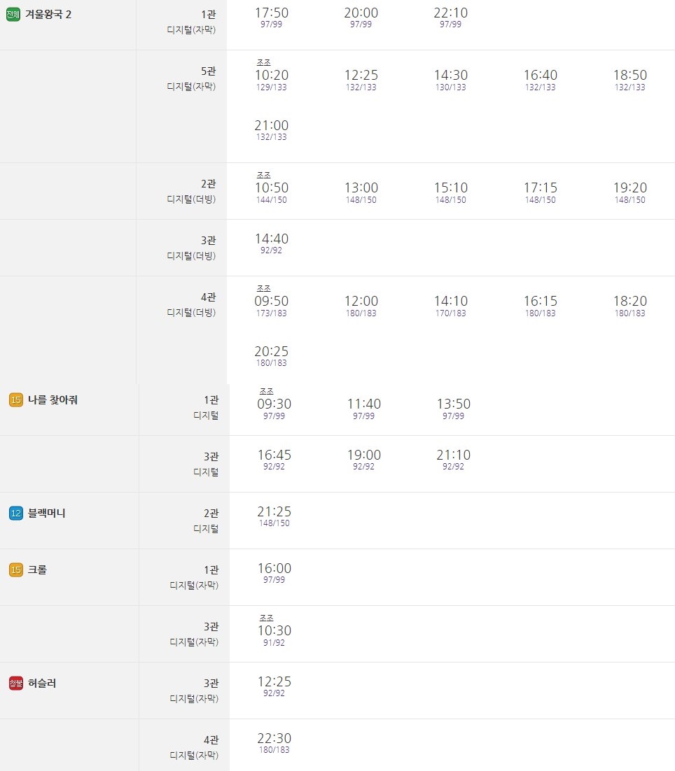 12월 1일(일) 기준 상영시간표를 살펴보면 겨울왕국 2, 나를 찾아줘, 블랙머니, 크롤, 허슬러 등 총 5편의 영화가 상영 중으로 소개되고 있습니다.