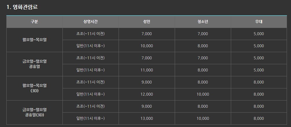 영화관 시설이 점점 좋아지면서 영화 관람요금이 점점 인상되는 만큼 통신사 멤버십 할인과 신용카드 제휴 할인은 꼭 받는 것도 활용하시기 바랍니다.