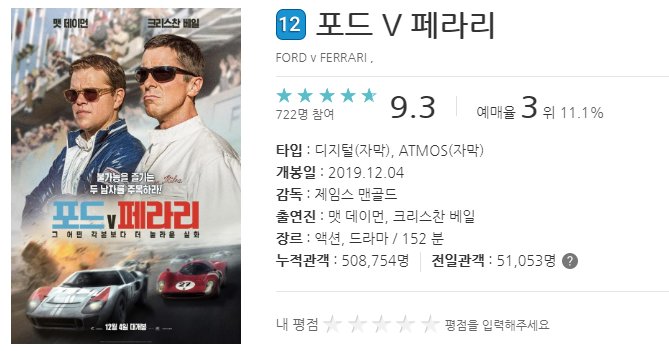 멧 데이먼, 크리스찬 베일의 포드 V 페라리는 자동차를 좋아하는 사람들이라면 한번쯤은 꼭 봐야할 영화가 아닐까 생각합니다.