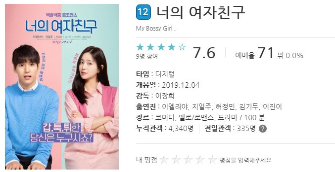 이밖에 연말을 맞이하여 많은 로맨스 영화도 개봉하고 있는데 이엘리야, 지일주 주연의 너의 여자친구 또한 이제 막 연애를 시작하거나, 연인들이 보면 좋은영화일것 같습니다.