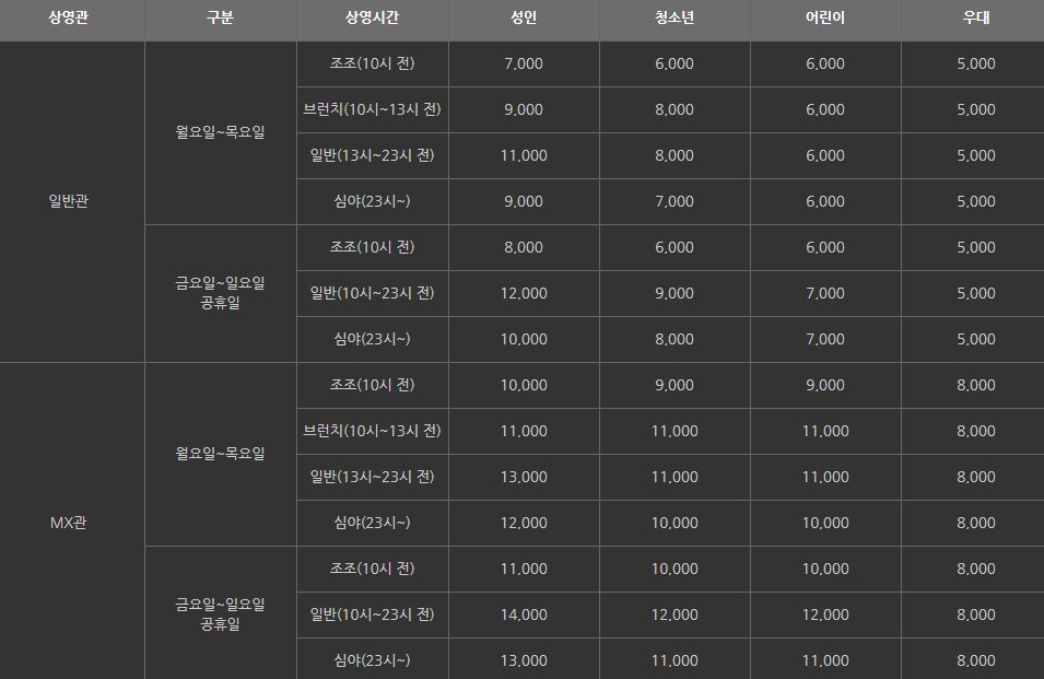 브런치타임(10시~13시)의 경우 관람요금이 9,000원인 반면 일반시간(13시~23시전)의 경우 11,000원 이기 때문에 영화관람시 참고하셔도 좋을것 같습니다.