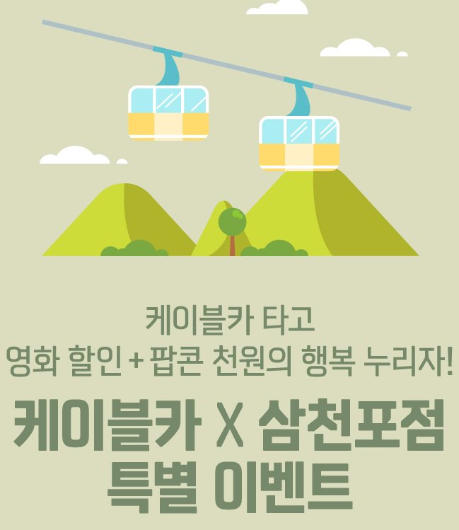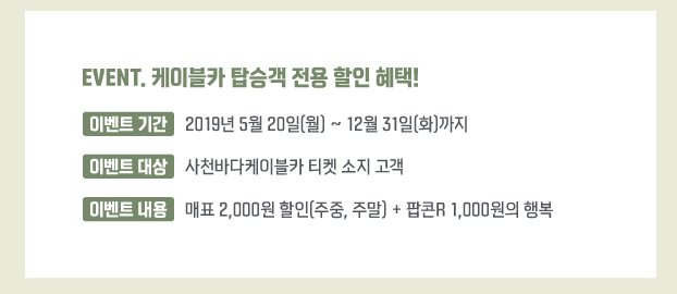 현재 삼천포 메가박스에서 진행 중인 이벤트도 있는데 사천 케이블카 탑승객의 경우 티켓을 소지하고 방문할 경우 영화관람료를 할인해주고 있다고 한다.