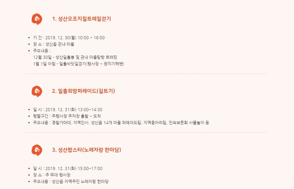 12월 20일부터 시작되는 제주 성산일출축제는 지역특산물 홍보 및 무료시식 코너가 있어서 제주도 음식 맛을 볼 수 있기도 하면서 만들기, 체험, 타로 등 다양한 즐길거리가 있어서 겨울철 여행지로도 많은 각광을 받고 있는 곳입니다.