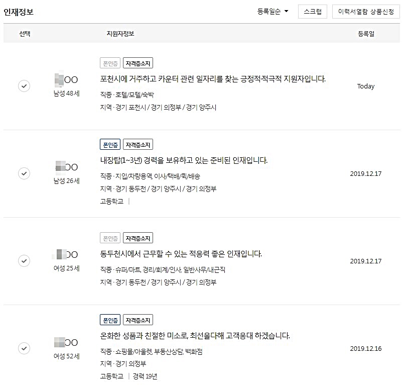 실제로도 의정부 벼룩시장 인재정보를 살펴보면 많은 사람들이 자신의 인재정보를 등록해 놓고 취업을 준비하는 사람들이 많은 것을 확인할 수 있으니 꼭 활용하길 바란다.