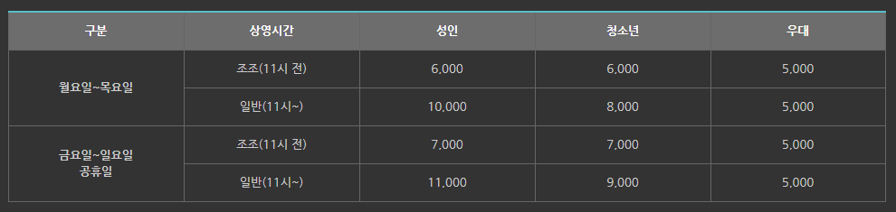 주중의 경우 10,000원 주말요금의 경우 11,000원으로 소개가 되고 있는데요 최근 영화관 시설이 점점 좋아지면서 영화관마다 영화 관람요금이 조금씩 비싸지는 것 같습니다.