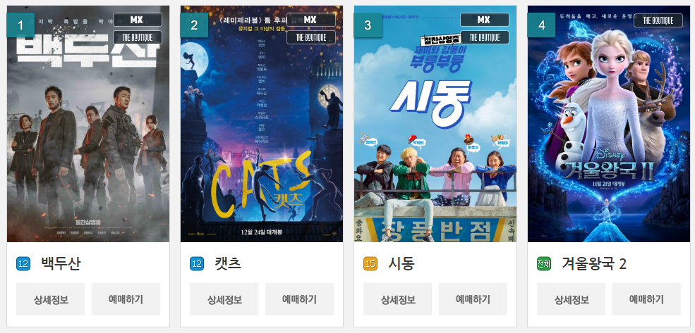 12월 19일 개봉한 영화 백두산이 개봉이후 예매순위 1위를 지키고 있는 가운데 크리스마스이브에 맞춰서 개봉 예정인 캣츠 또한 예매순위에서 많은 관심을 받고 있는 것을 확인할 수 있습니다.