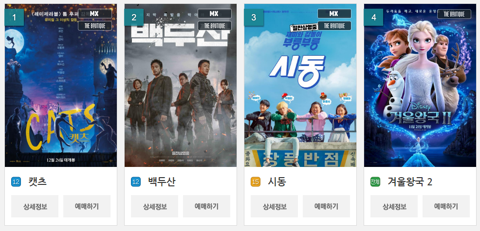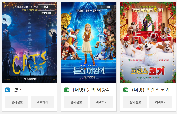 연말을 맞이하여 많은 분들이 영화 관람을 계획하고 있습니다. 현재 메가박스 예매순위를 살펴보면 개봉 예정인 캣츠가 1위를 달리고 있습니다.