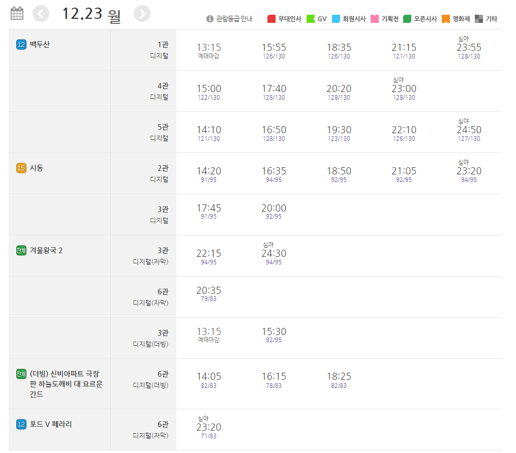 매일 시간표가 변경되는 메가박스 특성상 자세한 관람 일자별 시간표는 홈페이지에서 확인하시기 바랍니다.