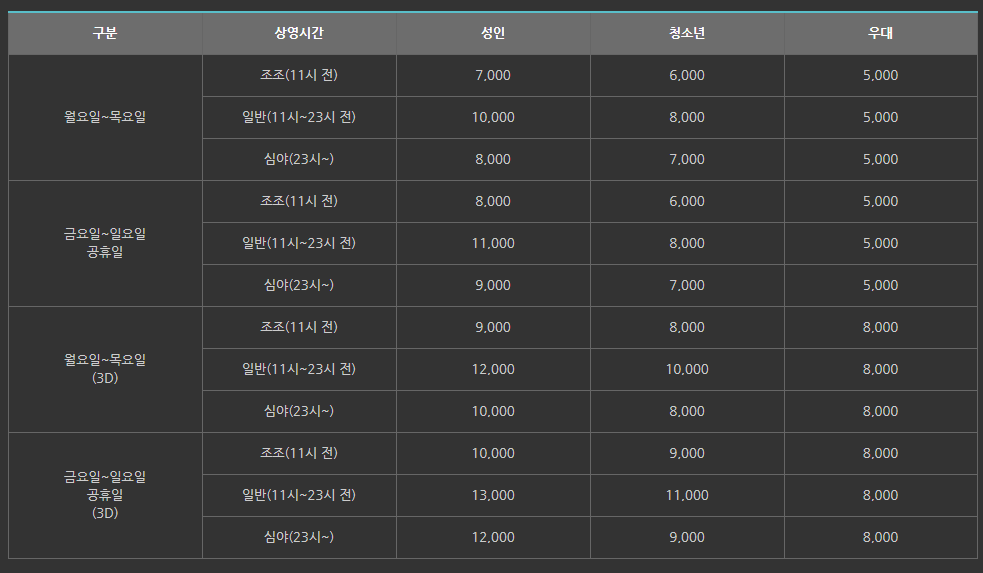 일반요금 기준이며 3D 영화의 경우 가격차이가 다를 수 있는 점 참고하시기 바랍니다.