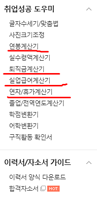 취업 성공 도우미란에 글자수, 맞춤법, 연봉계산기, 실수령액 계산기, 퇴직금 계산기 등 이제 막 취업을 했거나, 예비 직장인 들을 위한 자료가 많이 제공되고 있어서 그 활용도가 높다고 할 수 있다.