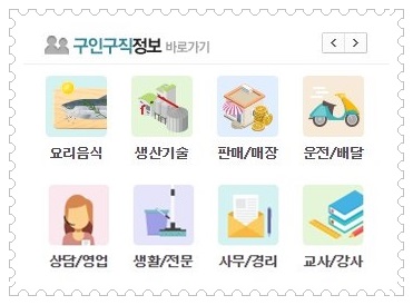일자리 종류는 크게 요리음식, 생산기술, 판매, 매장, 운전, 배달, 상담, 영업, 생활, 사무, 경리, 교사, 강사등으로 구성되어 있다.