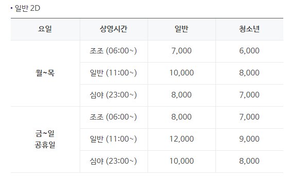 대부분의 영화관과 마찬가지로 주중 및 주말요금이 조금씩 다른 것을 알 수 있습니다.