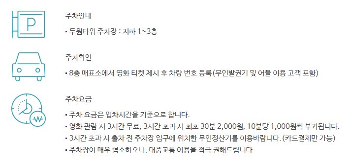 대부분의 사람들이 영화관 방문시 차량을 통해 이동하는 만큼 주차정보에 관심이 많다고 합니다.