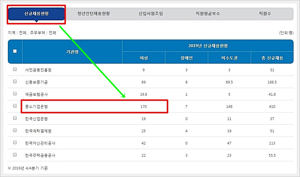 제일 먼저 신규채용현황 부분부터 살펴보면 중소기업은행이 총 신규채용을 410명 한 것으로 확인이 되었습니다.
