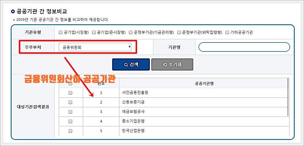 해당 주무부처를 선택하면 산하 기관들을 모두 확인할 수가 있는데요 연봉이 높은 금융위원회를 한번 조회해 봤습니다.