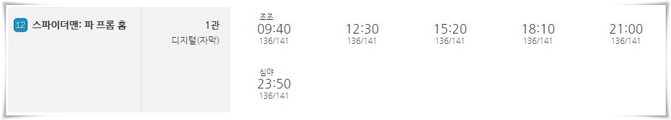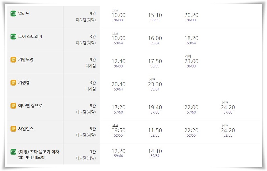 그밖에 여전히 꾸준한 사랑을 받고 있는 스파이더맨과 알라딘, 기생충도 상영 중으로 나와있습니다.