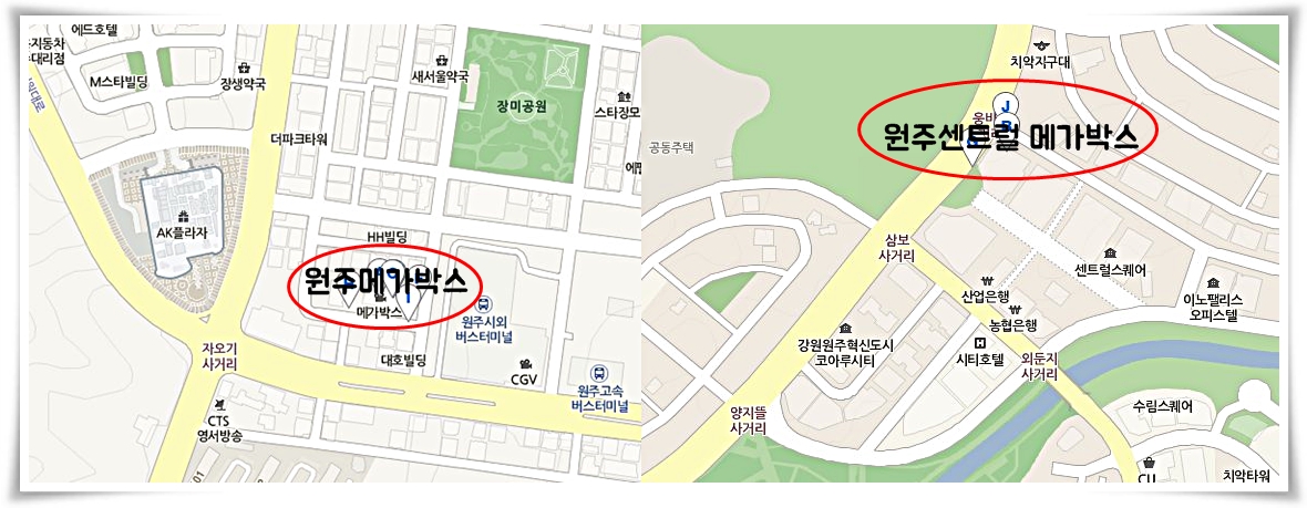 간혹 원주 메가박스와 원주센트럴 메가박스를 헷갈려하시는 분들이 있다고 합니다. 두곳의 위치는 전혀 다른곳에 있으니 이점 유의하시기 바랍니다.