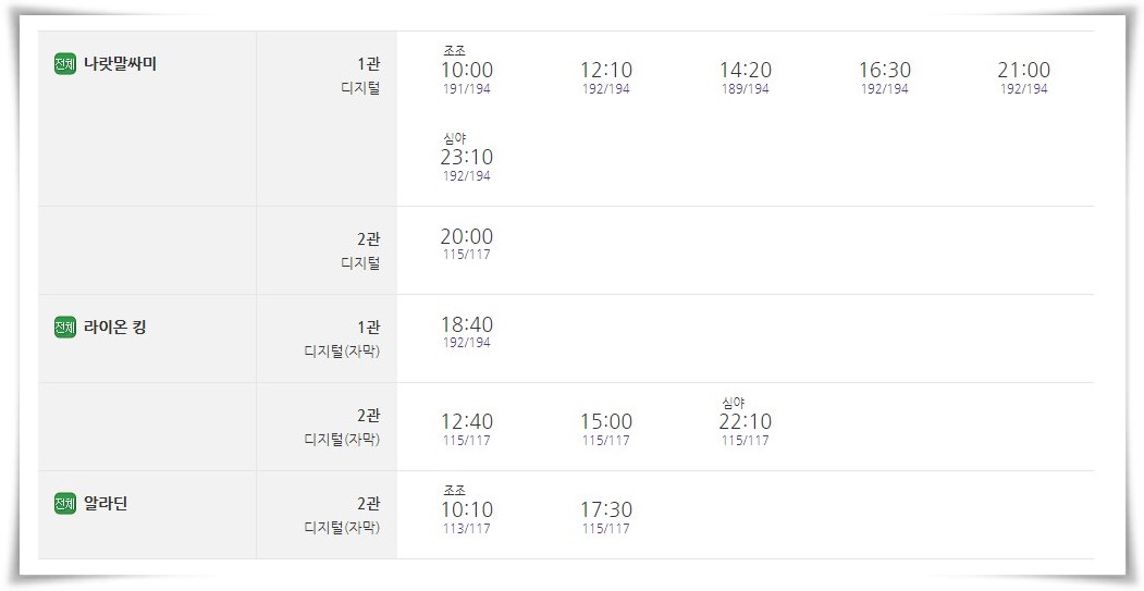 바로 어제 개봉한 나랏말싸미 와 라이온 킹, 알라딘이 현재 상영 중으로 나와있습니다. 모두 영화 예매순위 상위권을 차지하고 있는 영화들입니다.