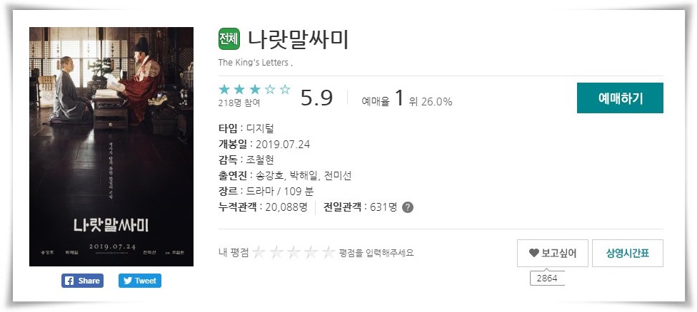 나랏말싸미가 개봉하면서 예매율 2위로 밀려나기도 했지만 여전히 많은 인기를 얻고 있습니다.