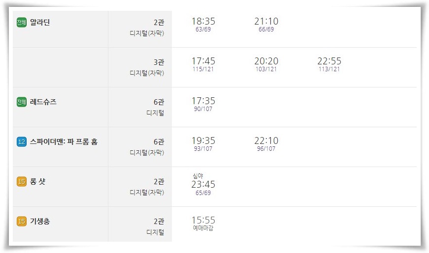 이외에도 알라딘, 레드 슈즈, 기생충, 스파이더맨 파 프롬 홈, 롱샷 등이 상영 중입니다. 많은 영화들이 상영하고 있는 만큼 영화를 선택하는데 조금은 어려울 수도 있겠네요.