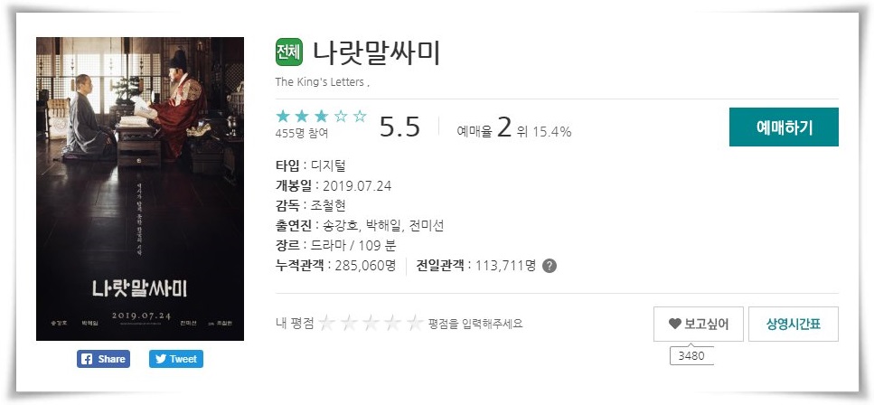 두 번째 소개할 영화는 나랏말싸미입니다. 7월 24일 개봉한 이영화는 한글 창제에 관한 이야기를 담고 있습니다.