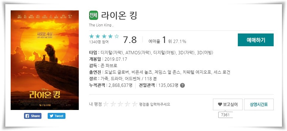 제일 먼저 소개할 영화는 라이온 킹입니다. 예매율 1위를 달리면서 많은 관객들의 사랑을 받고 있는 영화입니다.